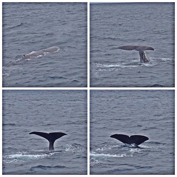 När vi pratade med turistbyrån i Svolvaer sa de att turen varade 2-4 timmar, men det var en väldigt optimistisk info…I 10 grader och 5 sekundmeter gav vi oss ut med M/S Reine och det tog ca 5 timmar innan vi ens såg en val, men tillslut dök den upp! Första gången visade den sig bara en sekund, jag hann se stjärtfenan väldigt långt borta. Jag tänkte då att hoppas inte detta var allt?! Vår båt lyssnade efter valens klickljud och på så sätt kunde vi följa efter och åka närmare andra gången den kom upp för att ta luft. Andra gången såg vi valen riktigt bra! Det var en kaskelotval, riktigt kul att se. Den låg och flöt på ytan ett bra tag tills den tillslut dök ned i djupet igen. Båten var på 2 500 meters djup, så valen hade en bra bit ned till jättebläckfiskarna som den åt.